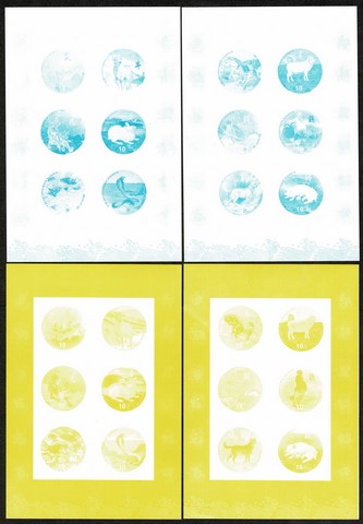 FAUNA ** Coréia do Norte – Ano 1999 – PROVAS de cor da série Yvert 2920A/M (diversos, incluso Cachorro, Macaco etc) sem picote e em mini folhas nas cores: Azul, Amarelo, Preto e Magenta