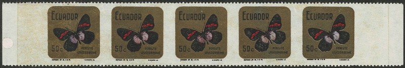 FAUNA ** Ecuador – Yv 827 (Borboleta) Variedade: Tira de 5 horizontal com total falta do picote vertical.