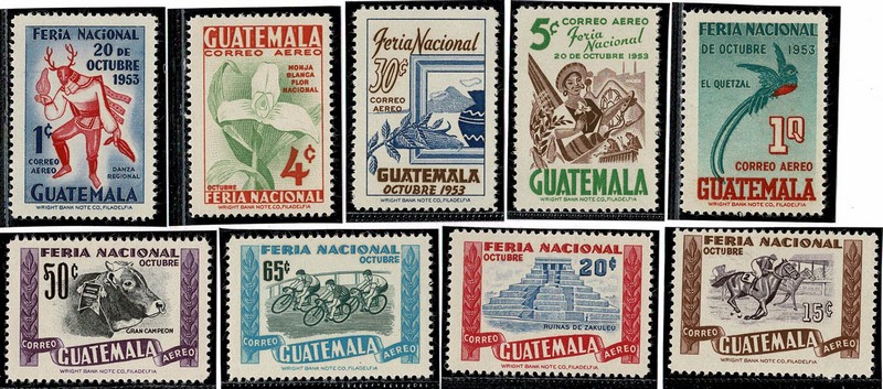 FAUNA * Guatemala – Ano 1953 – Yvert Aéreos 189/197 (Ave, Cavalo, Boi, além de outros temas) Série completa bem limpa, só com marca de charneira e sem ferrugem – 85 Euros