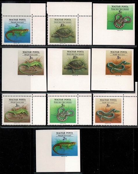 FAUNA ** Hungria – Ano 1989 – Yvert 3223/7 (Tartaruga e outros repteis) com e sem picote. Série completa e todos canto de folha
