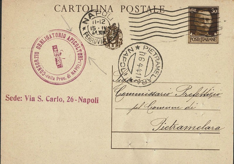FAUNA – Itália – Abelhas – 1941 – Inteiro Postal circulado internamente com chegada. Carimbo circular frontal em vermelho : “Consorzio Obbligatorio Apicoltori, della Província di Napoli”