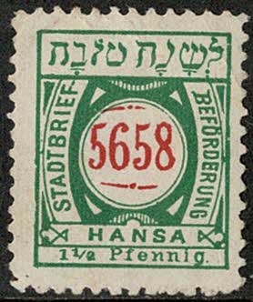 JUDAICA (*) Cidade de Breslau (Alemanha) Agente E – Ano 1897 – Catálogo Michel 15 – Selo local que só podia circular dentro da cidade e em homenagem ao ano Judeu de 5658