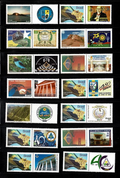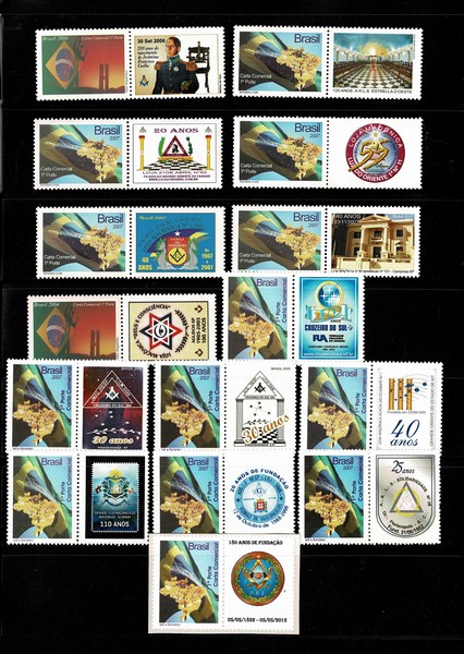MAÇONARIA ** Brasil – Coleção com 29 selos personalizados DIFERENTES (vinheta lateral com propaganda) todas alusivos à eventos Maçônicos. Grande maioria dentro do começo dos anos 2000 (até +/- ano 2008)