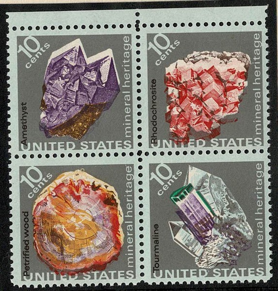 MINERALOGIA ** Estados Unidos – Ano 1974 – Quadra, Yv 1025/1028, com visível deslocamento de parte das cores, lateralmente