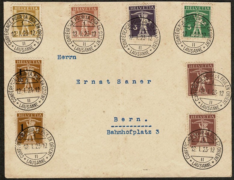 PAZ – Suiça – Ano 1923 – Envelope circulado ? para Berna. 8 selos e cada um deles com o carimbo individual referente a Conferência pela Paz no Oriente 12.1.1923. Peça limpa, mas com vinco vertical central não atingindo nenhum selo