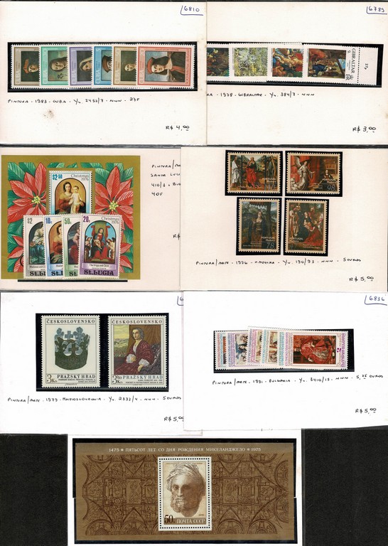 **/* PINTURA – 151 ITENS EM SUPORTES – Coleção mundial (com minima repetição) onde temos o selo junto com sua descrição de ano, numeração pelo catálogo Yvert e seu valor em Euros. Grande diversidade de países e períodos. Todos completos, estando diversos com seus blocos. Todos sem carimbo. Fotografamos alguns suportes, para que o eventual comprador tenha noção do que estamos falando. O valor total dos suportes é de R$ 971,00. A proporção usada é cerca de 1 Real o Euro