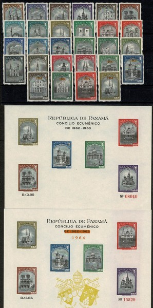 ** Religião (outros/diversos) Ano 1964 – Panama – Concilio Ecumênico – Yvert Aéreo A313/334 335/340 Blocos 15/16 – Apenas 5 selos com minimos pontos de ferrugem