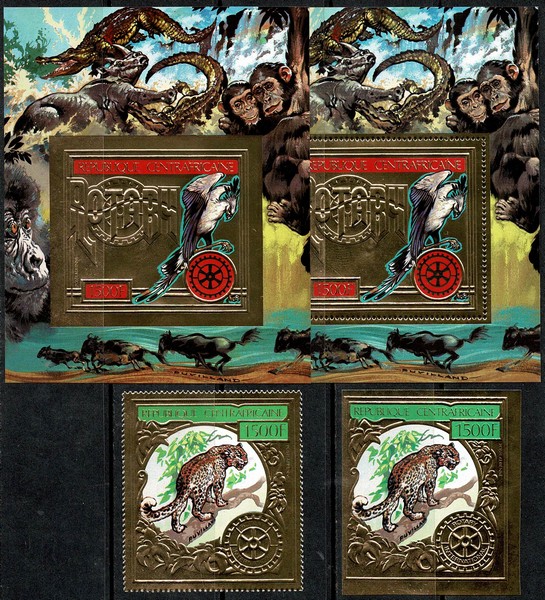 ROTARY ** Centroafricana – Ano 1982 – Michel 819A e B + Blocos 172A e B – Com e sem picote. Temática Fauna. Selos/Blocos de “Ouro” – 106 Euros