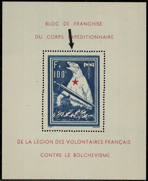 2ª GUERRA ** Ano 1941 – LEGIÃO FRANCESA CONTRA O BOLCHEVISMO (LVF) O mundialmente conhecido “Bloco do Urso”, com a variedade catalogada “Traço vertical sobre o picote superior”. Michel Bloco I/I – LUXO. Origem e qualidade europeia – 1.200 Euros.