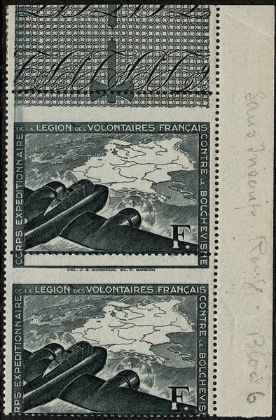2ª GUERRA  ** Ano 1941 – LEGIÃO FRANCESA CONTRA O BOLCHEVISMO (LVF) Selo Michel II – Par vertical com marcantes variedades: Falta total da cor vermelha + visivel deslocamento do picote. Margem direita de folha.