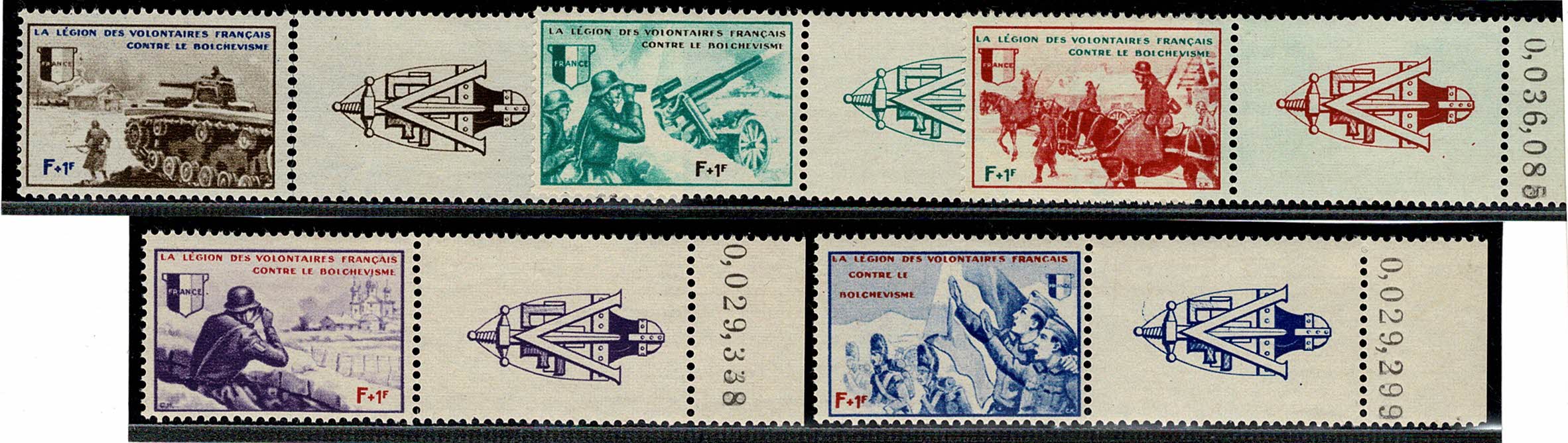 2ª GUERRA ** Ano 1942 – LEGIÃO FRANCESA DE VOLUNTÁRIOS (LVF) Michel VI/X – Série completa com a vinheta lateral. No 1º valor está destacada.