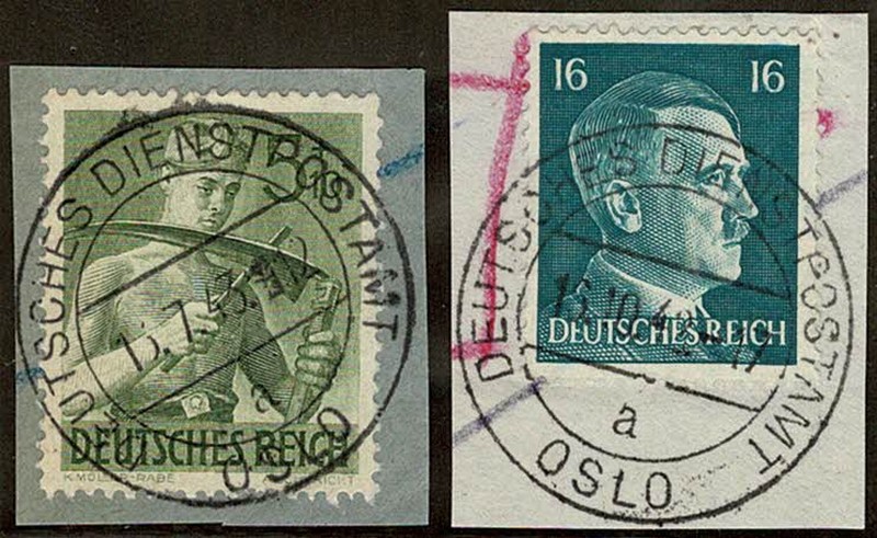 2ª GUERRA ◉ Anos 1942/1943 – ALEMANHA REICH/NORUEGA – 2 fragmentos com selos do Reich (comemorativo e do Fuhrer) ambos com carimbo do “Serviço do Correio Alemão em Oslo”.