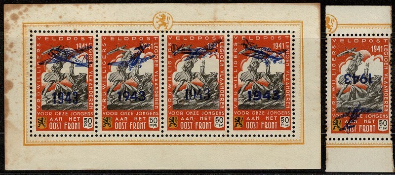 2ª GUERRA  */(*) Ano 1943 – LEGIÃO FLAMENGA (BÉLGICA) Michel VI em mini folha completa sem goma e com manchas de ferrugem + variedade VIK (sobrestampa invertida) com pontos de ferrugem + acentuados. Pede-se verificar