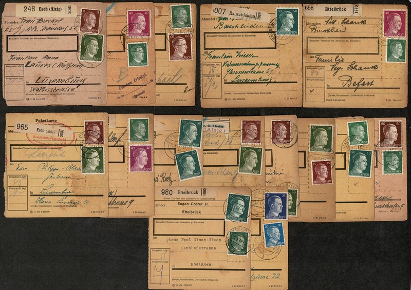2ª GUERRA – Anos 1943/1944 – REICH – Série do Fuhrer – Conjunto com 15 recibos de envio de pacote, todos selados com selos da série alusiva. Circulação interna e alguns para Luxemburgo.