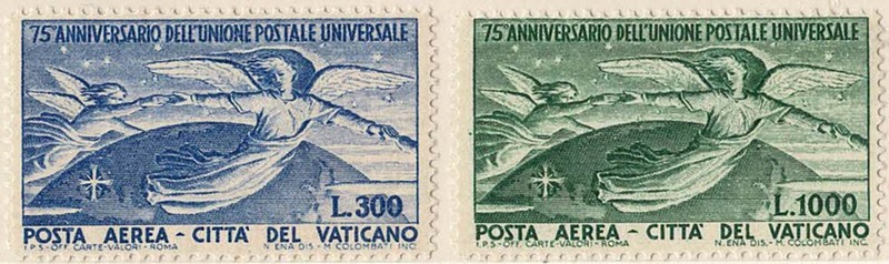 UPU(UNIÃO POSTAL UNIVERSAL) * Vaticano – Ano 1949 – Yvert Aéreos 18/19 – Série completa muito limpa, só com charneira e sem ferrugem – 125 Euros
