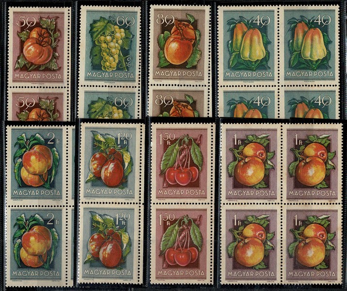 UVA/VINHO * Hungria – Ano 1954 – Série completa Yvert 1130/1137 (Frutas) em quadras – 68 Euros +.