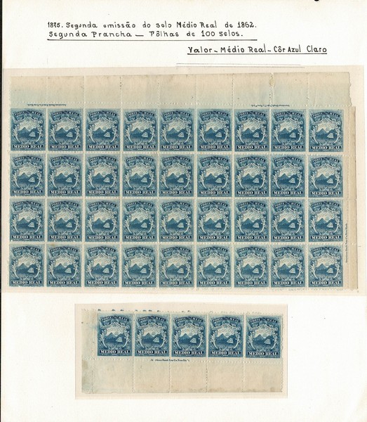** COSTA RICA – Yvert 1 – Sem linhas horizontais no fundo (2ª Tiragem) Folha de exposição, composta de bloco de 36 selos !!, margem superior de folha, ficando 4 selos com a legenda AMERICAN BANK de forma invertida na parte superior e outros 2 selos com ela na margem esquerda. Acompanha ainda tira de 5 horizontal com a legenda em 2 selos na parte inferior. Desprezíveis pontinhos de ferrugem e algum reforço no bloco maior. Seguramente único desta forma no mercado nacional. Peça para o expositor de nível internacional