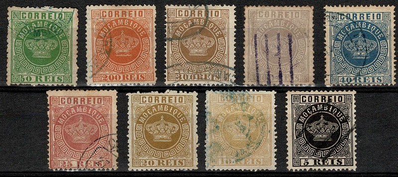 ◉ MOÇAMBIQUE – Yvert 1/9 – 1ª Série completa – Nº 3 novo sem goma. Misto nas 2 picotagens. Cerca de 100 Euros