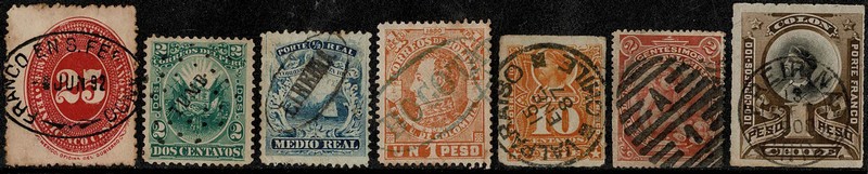 CARIMBOLOGIA ◉ AMÉRICA LATINA – Cartela com 62, boa parte sobre selos clássicos (século 19) Predomina à América do Sul ..