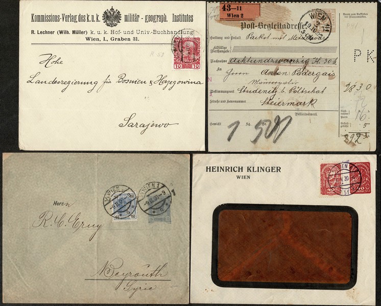 AUSTRIA – Lote com 30 peças (2 são só frentes) circuladas diversas. Incluso registrados, 2 censurados (1ª Guerra), destino Siria e 3 vindo para o Brasil (S.Paulo e Rio de Janeiro x 2) Entre antes dos anos 10 e década de 30.