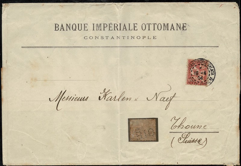 LEVANTE (Escritório Francês) Ano 1904 – Cinta vincada ao meio na vertical, timbrada do Banque Imperiale Ottomane, circulado de Galata para a Suiça, com chegada. Selo facial 10c com a perfuração alusiva e depois selo solto com a mesma perfuração. Peça ainda no suporte original onde foi adquirida e com um custo de 40 Euros !.