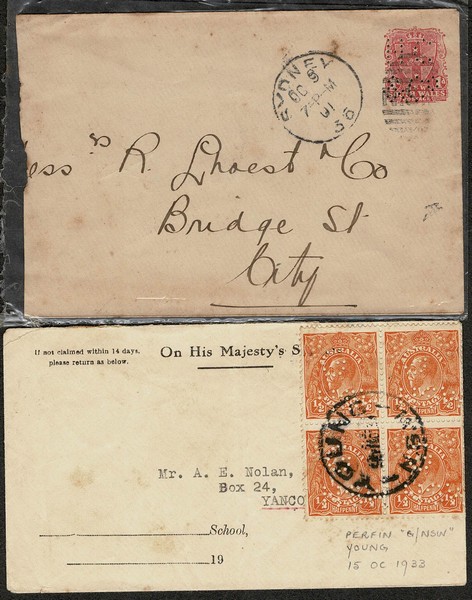NOVA GALES DO SUL – Lote com 2 peças circuladas internamente: Ano 1901, inteiro postal tipo envelope, com perfuração no selo fixo (escasso) com refilo no lado esquerdo e o outro circulado em 1933 com quadra de selo Australiano com perfuração oficial G/NSW. Vide imagem.
