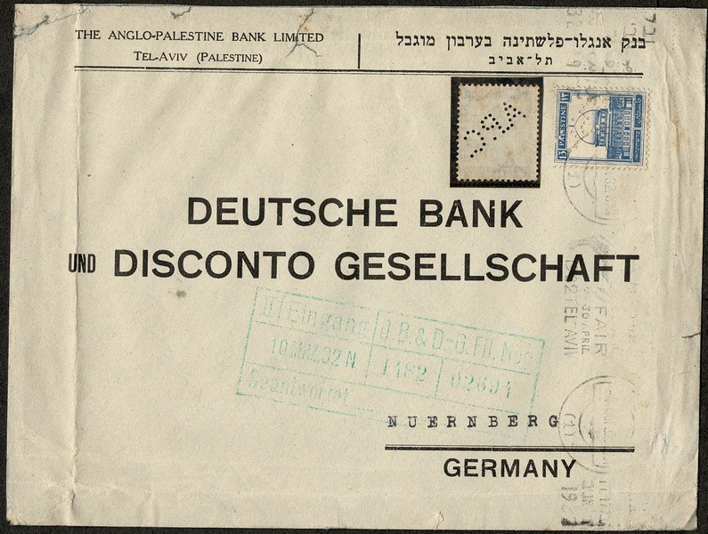 PALESTINA – Ano 1932 – Envelope timbrado circulado para a Alemanha, com carimbo de recepção da empresa. Selo regular com perfuração alusiva + selo solto, com a mesma perfuração. Peça com duplo vinco nos 2 sentidos