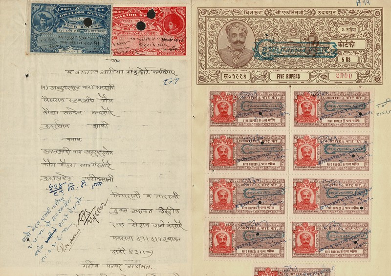 ESTADOS PRINCIPESCOS DA INDIA – Processos Judiciais – Pasta tipo catálogo, contendo 26 documentos diversos, sendo parte papéis selados. Dada a dificuldade na escrita, é dificil precisar a data deles, mas devem ser entre século 19 e começo do 20. Alguns bem vistosos
