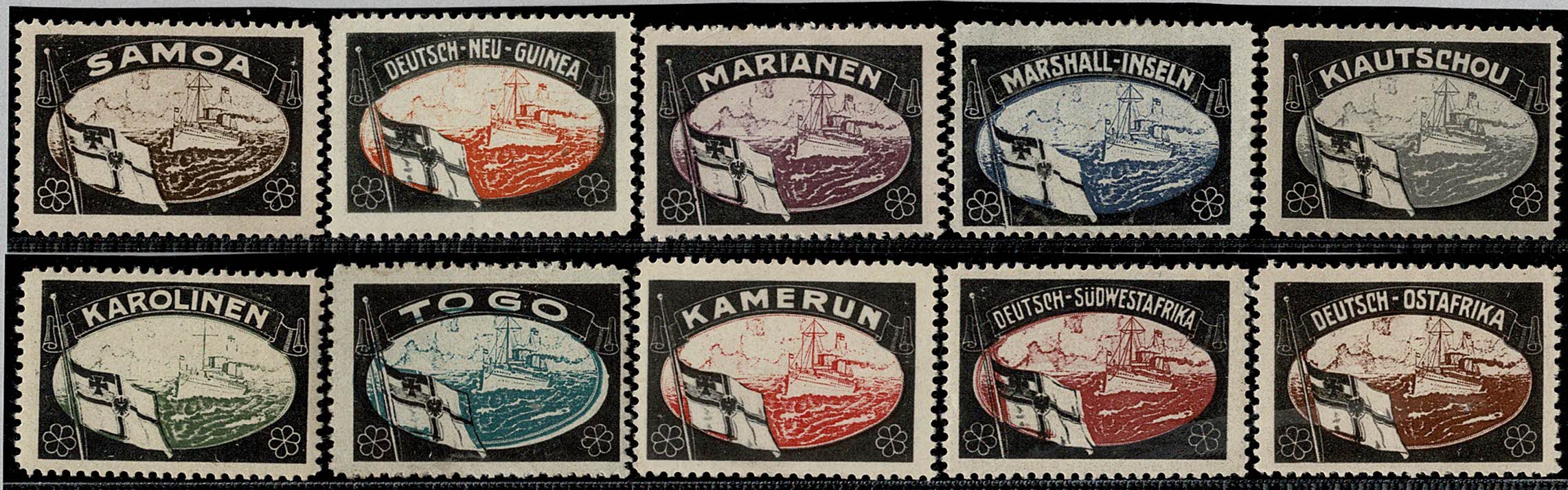 (*) ALEMANHA – Colonias Alemãs – Lote com 10 diferentes Colonias (série completa) figurando bandeira e o Iate Hohenzollern. Cerca do ano 1900.