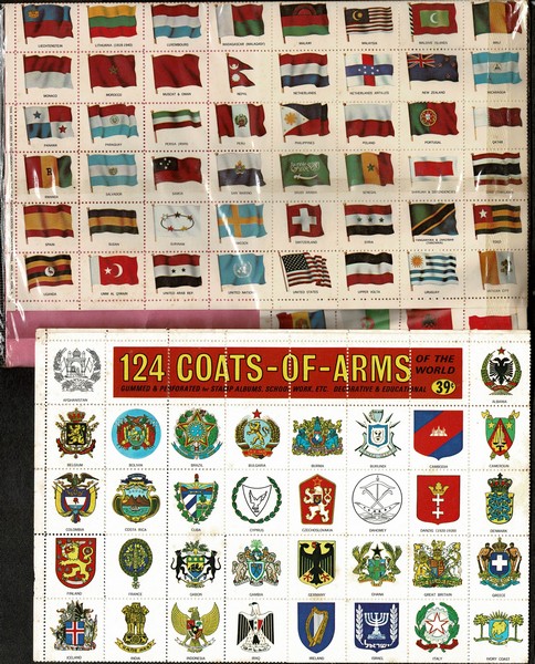 SÓ BANDEIRAS/ESCUDOS – Cerca de 500, de 4 séries diferentes, sendo 2 aparentemente completas (ambas de Bandeiras) Parte estão aderidas entre si. Parecem todas terem sido impressas nos USA.