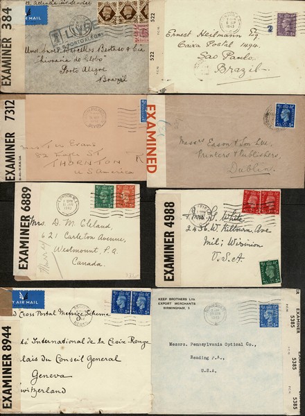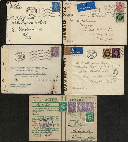 INGLATERRA – 2ª Guerra – Lote com 13 envelopes circulados, maioria para os Estados Unidos. Incluso 1 com perfin, 1 com censura da RAF e 4 vindo para o Brasil (1 taxado, com carimbo e 1 com censura no destino – Porto Alegre)