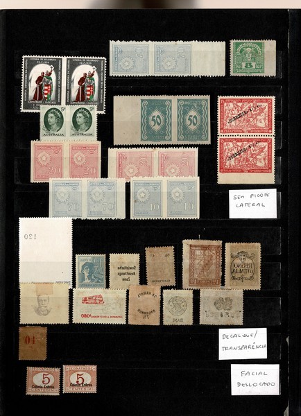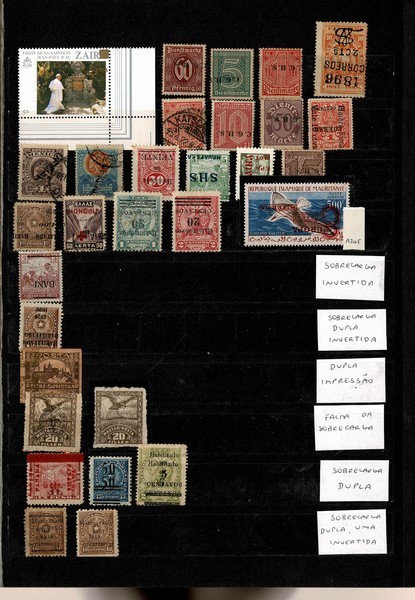 SÓ VARIEDADES – Cartelas contendo um total de 101 selos com e sem carimbo, todos diferentes. Entre século 19 até meados da década de 80. Grande diversidade de países , todas separadas pelo tipo da variedade, onde algumas tem o selo normal para comparativo. São 18 tipos de variedades diferentes: Facial deslocado, sobrecarga dupla cores deslocadas, sobrecarga/sobreestampa invertidas (incluso Mauritânia Yvert Aéreo 20F) picotes parciais (parte em pares e só calculados 1 item) decalque/transparência, sobreestampa/sobrecarga dupla, sobrecarga/sobreestampa dupla invertida, pliê, centro deslocado, deslocamentos variados de picote, sobrecarga/sobreestampas deslocadas, falta de cor, Centro Invertido (Costa da Somália) Bissectados etc Aqui saindo por apenas R$ 4 cada.