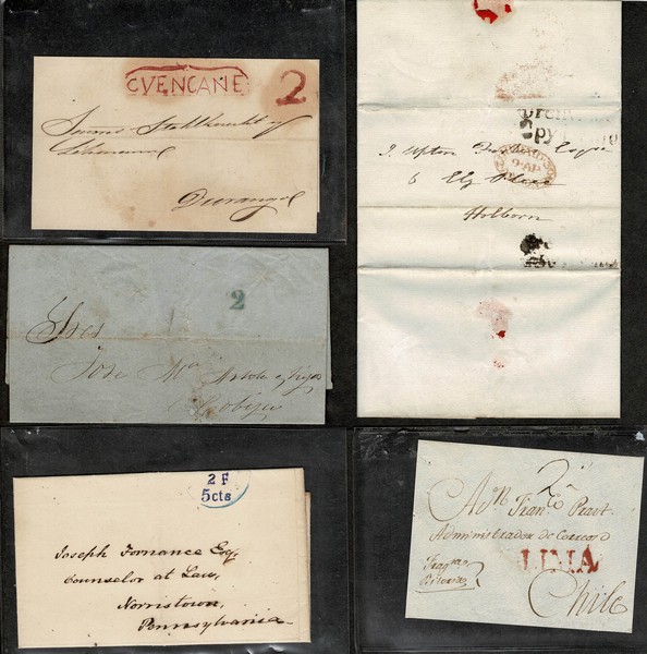PRÉ FILATÉLICOS AMÉRICAS – Lote com 5 sobrecartas circuladas, com carimbos e marcas à estudar: Bolivia (ano 1859) México (1849 com carimbo recomposto) Estados Unidos (1847 com carimbo recomposto) Perú (1830 – só frente) e Canada (1830)