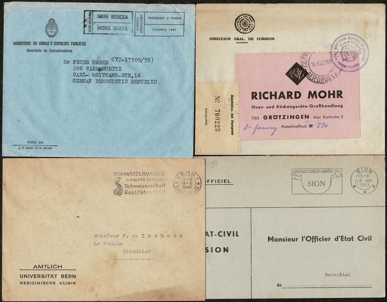 ISENTOS/OFICIAIS – Lote com 21 envelopes circulados, maioria dentro do seu próprio país e sem selos, por se tratarem de correspondência isenta e/ou oficial. Países: Suiça (maioria) Perú x 2, Argentina x 2, Paraguai x 2, Honduras e Belize. Década de 30 a 90.