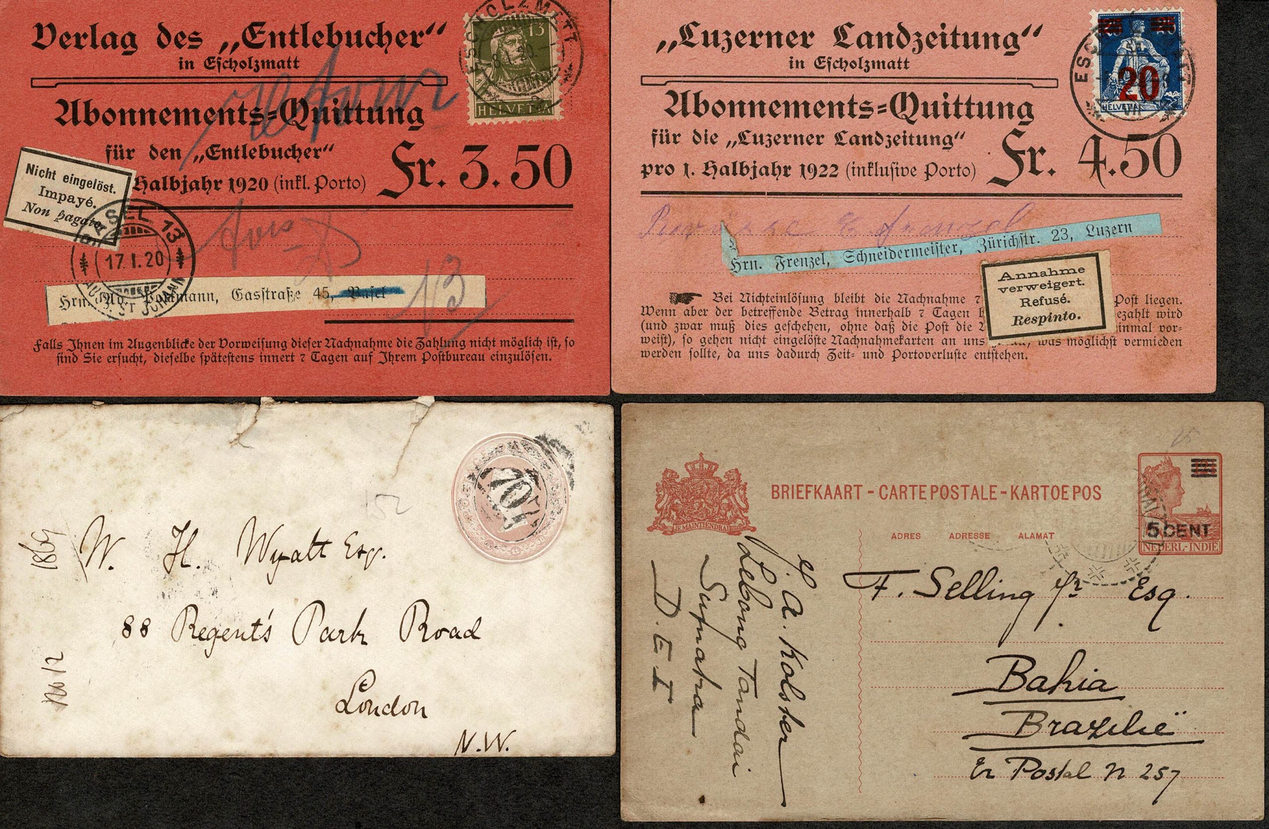 4 PEÇAS CIRCULADAS – Pequeno conjunto com 4 peças circuladas: Suissa (2 cartões circulados internamente e devolvidos por diferentes razões e com a devida etiqueta alusiva – Anos 1920 e 1922) Inteiro Postal da Inglaterra circulado internamente com chegada (Ano 1869) e Inteiro Postal das Indias Holandesas, vindo para o Brasil ! em 1929, mas sem chegada.